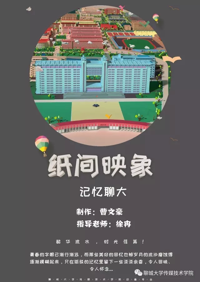 《纸间映象》是由徐冉老师指导的毕业设计,该片采用数字化折纸风格,以聊城大学的校园场景为基础,以校园公交车为视线引导,选择一镜到底的镜头表现方式,聊大校园的基本面貌在生长的过程中逐渐显现,体现一种游览校园的流畅感,风格清新又动感十足。