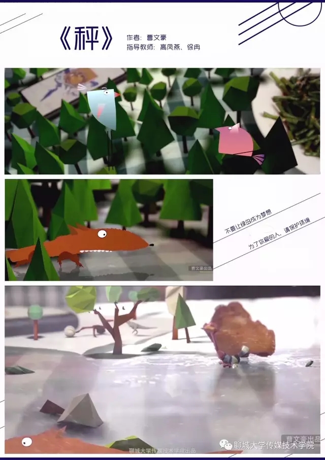 由高凤燕老师和徐冉老师指导的作品《秤》是一部实验动画片,作品采用定格拍摄技术与三维动画技术相结合的创作方式。运用蔬菜、肉、森林等元素来表现生态平衡、人与自然的关系,宣扬一种人与自然和谐相处的绿色生活。
