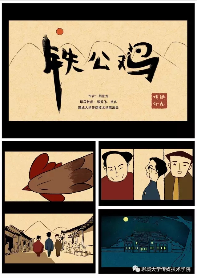 邱秀伟老师和徐冉老师联合指导的作品《铁公鸡》立意新颖,表现形式贴近中国水墨画。该作品根据老舍给聊城传统名吃《魏氏熏鸡》起雅名的经历改编成励志小故事,讲述了一只小鸡感觉“鸡生无聊”,通过做梦知道了铁公鸡名字的由来和铁公鸡可以给人们在味觉上带来幸福,醒来后有了目标,奋发图强,努力生活,做到了“鸡生有聊”。作品以诙谐幽默的方式弘扬了聊城的地域美食文化,具有较强的视觉表现力和节奏感。