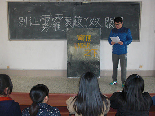 活动事先让同学们走出课堂做社会调查,以“雾霾”为主题进行受访调查,并在调查结束后整理出调查报告,在活动时发表报告。活动伊始,宣读雾霾调查报告,以“雾霾的成分”、“雾霾的危害”、“雾霾的产生原因”及“雾霾的治理措施”四点为报告主题进行雾霾科普教育。活动中,同学们展示了有关雾霾的图片,并围绕雾霾制作了手抄报和漫画,随后,同学们集体观看了纪录片《穹顶之下》,并以雾霾的形成与防治为主题进行观后总结。活动最后,同学们将雾霾的主要成分写在名牌上,以撕名牌的方式让同学们更深入的了解雾霾,远离雾霾。